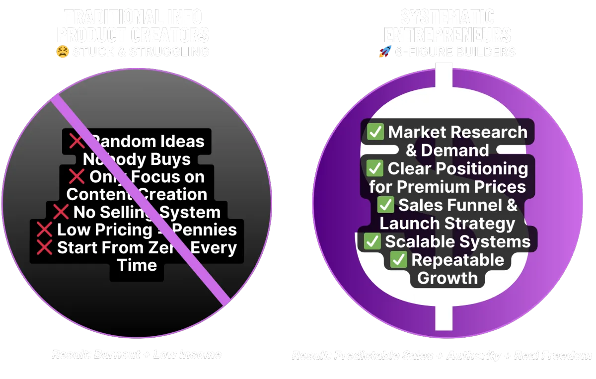 Focuses only on creation, ignoring the selling system - No proper market research, no sales funnels, no systematic approach to turning products into profit