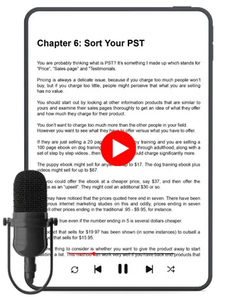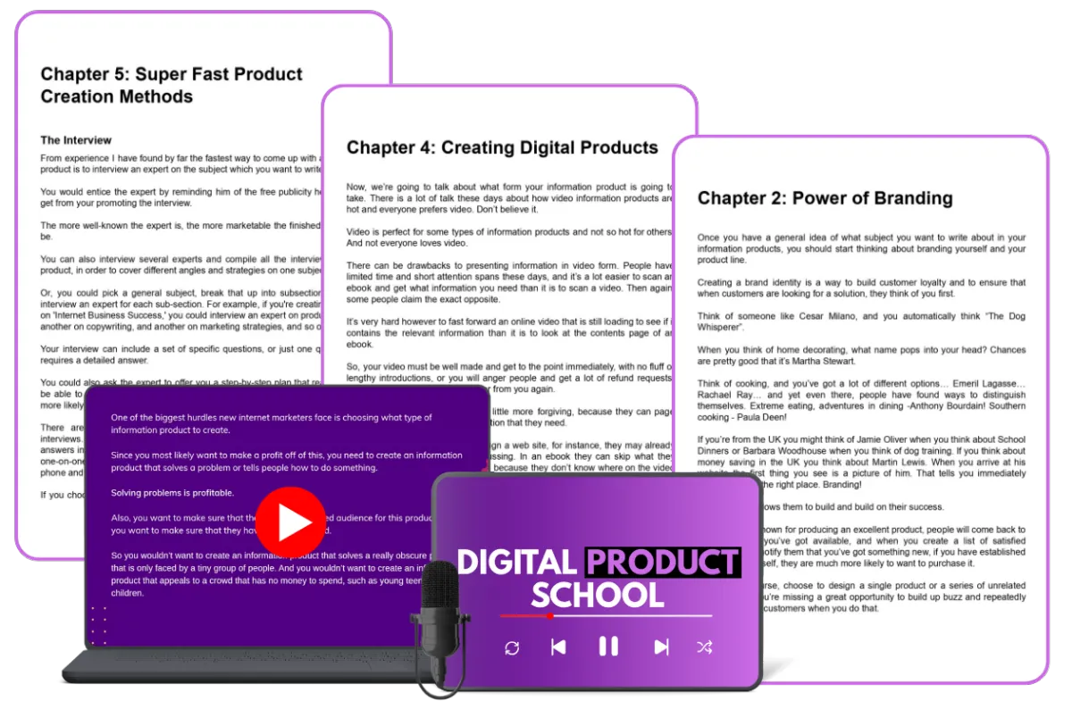 Complete Video & Audio Training Series: In-depth lessons covering Solving Problems, Power of Branding, Find a USP, Creating Digital Products, Super Fast Product Creation Methods, Sort Your PST, The Sell, and Mindset of Success.