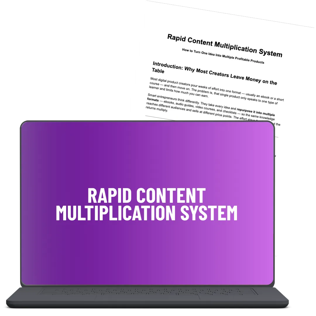 BONUS #2: Rapid Content Multiplication System: How to turn one piece of content into multiple formats - ebooks, audio guides, video courses, and checklists - maximizing your profit from every idea.