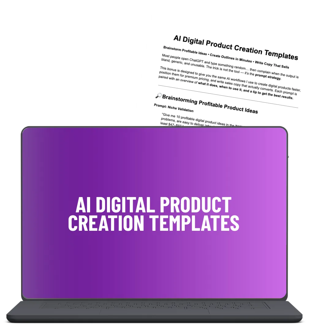 BONUS #1: AI Digital Product Creation Templates: Ready-to-use ChatGPT prompts and templates that help you brainstorm profitable product ideas, create compelling content outlines, and write sales copy that converts.